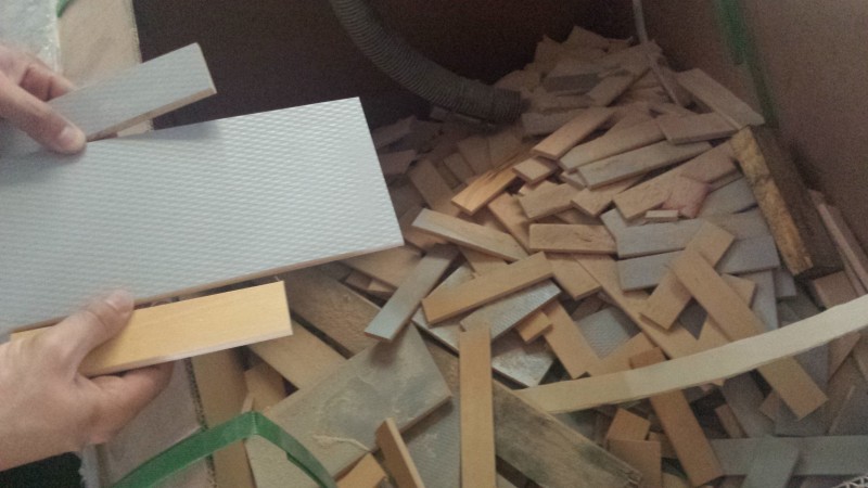 Peces de faig tractat i xapa de melamina, en retalls petits.