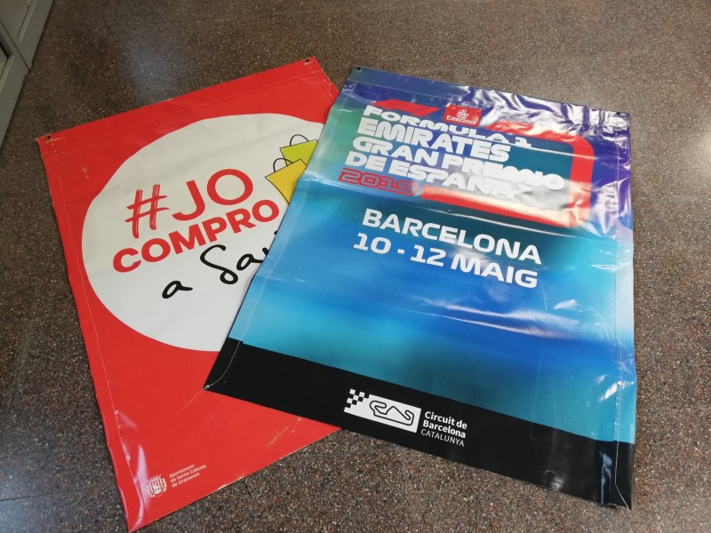 Peces de pvc reforçat provinents de campanyes publicitàries de mida aproximada 1x1,20m.